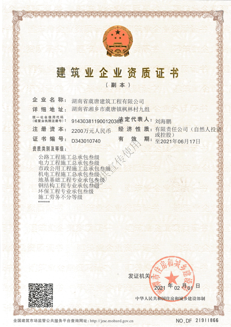鋼結(jié)構(gòu)專業(yè)承包叁級、環(huán)保工程專業(yè)工程承包叁級、承裝(修、試)電力設(shè)施四級、路面養(yǎng)護(hù)乙級資質(zhì)、橋梁養(yǎng)護(hù)乙級資質(zhì)、隧道養(yǎng)護(hù)乙級資質(zhì)、交通安全設(shè)施養(yǎng)護(hù)乙級資質(zhì)、施工勞務(wù)不分等級等多項(xiàng)施工資質(zhì)。